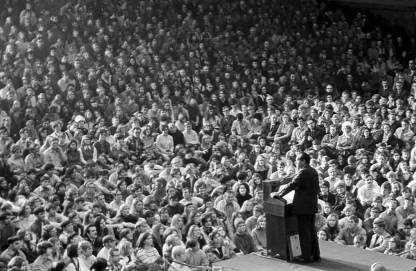 On Thursday, Jan. 14, anywhere from 7,000 to 8,500 filled the university’s Coliseum as President Richard Nixon paid a visit and presented coach Bob Devaney a plaque declaring the 1970 Huskers the champions of college football.