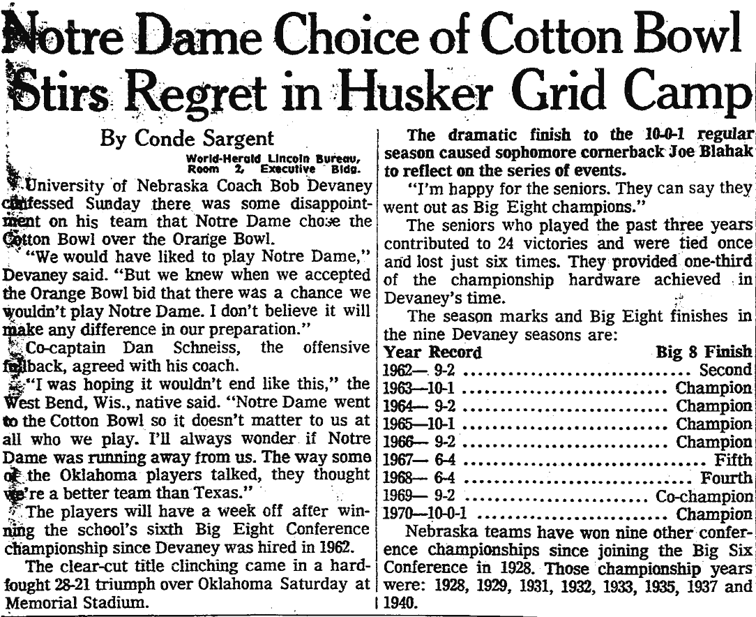 Coach Bob Devaney said he “would have liked to play Notre Dame,” but he insisted the team would be motivated regardless of the opponent.