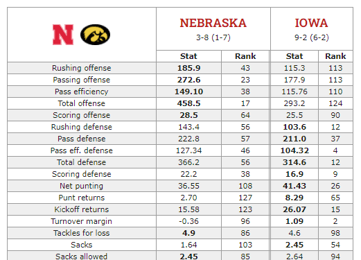 Here’s how the Cornhuskers and Hawkeyes match up statistically entering their Nov. 26th game in Lincoln. Average national ranking in categories listed: Nebraska 59.6, Iowa 55.4.