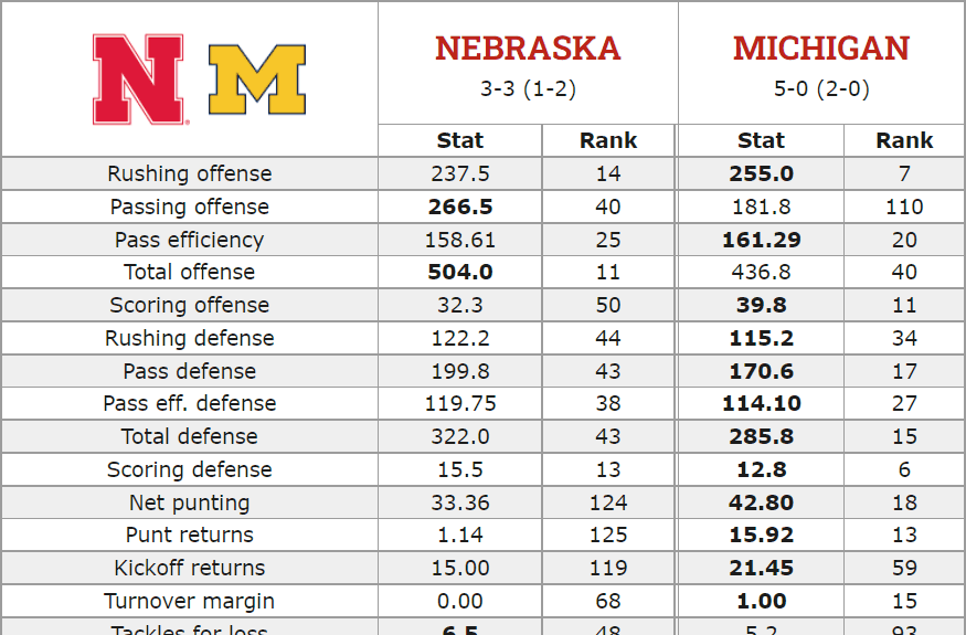 Here’s how the Cornhuskers and Wolverines match up statistically entering their Oct. 9th game in Lincoln. Average national ranking in categories listed: Nebraska 52.1, Michigan 34.3.