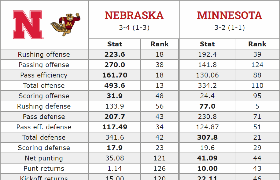 Here’s how the Cornhuskers and Golden Gophers match up statistically entering their Oct. 16th game in Minneapolis. Average national ranking in categories listed: Nebraska 54.3, Minnesota 50.19.
