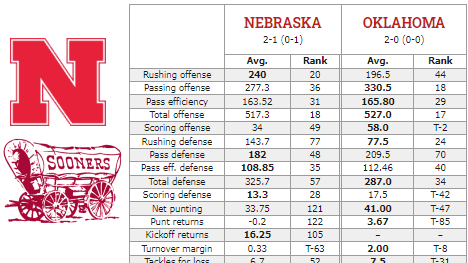 Here’s how the Cornhuskers and Sooners match up statistically entering their Sept. 18th game in Norman. Average national ranking in categories listed: Nebraska 54.44, Oklahoma 40.375.