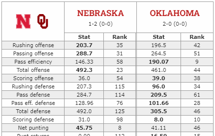 Here’s how the Cornhuskers and Sooners match up statistically entering their Sept. 17th game in Lincoln. Average national ranking in categories listed: Nebraska 76.7, Oklahoma 47.5.