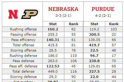 Here’s how the Cornhuskers and Boilermakers match up statistically entering their Oct. 15 game in West Lafayette. Average national ranking in categories listed: Nebraska 82.3, Purdue 49.9.