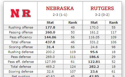 Here’s how the Huskers and Scarlet Knights match up statistically entering their Oct. 7 game in Lincoln. Average national ranking in categories listed: Nebraska 81.6, Rutgers 65.8.