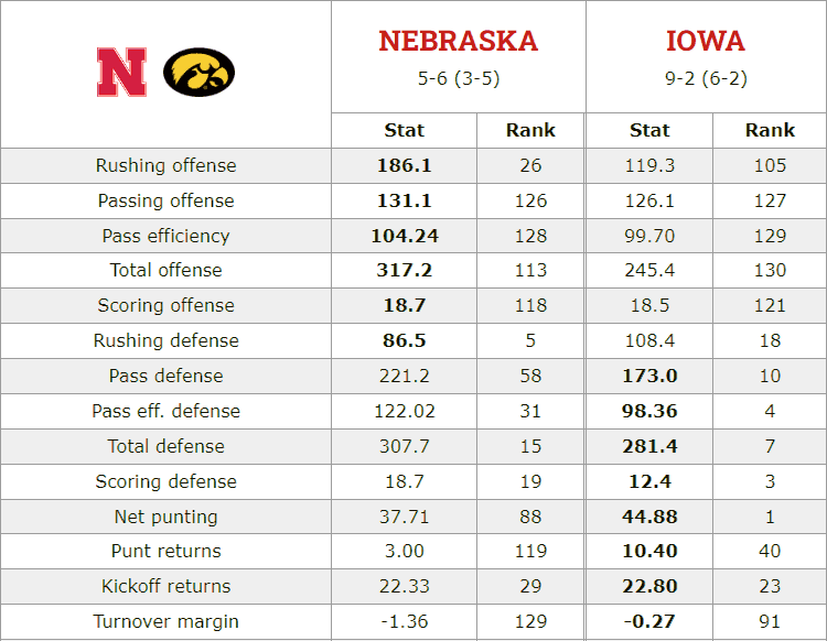 Here’s how the Cornhuskers and Hawkeyes match up statistically entering their Nov. 24 game in Lincoln. Average national ranking in categories listed: Nebraska 63.9, Iowa 53.8.