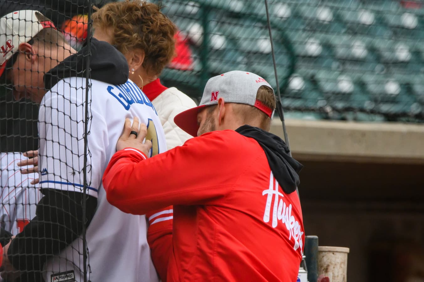- Head coach Will Bolt chats with former Husker Alex Gordon prior to Gordonās ceremonial first pitch.