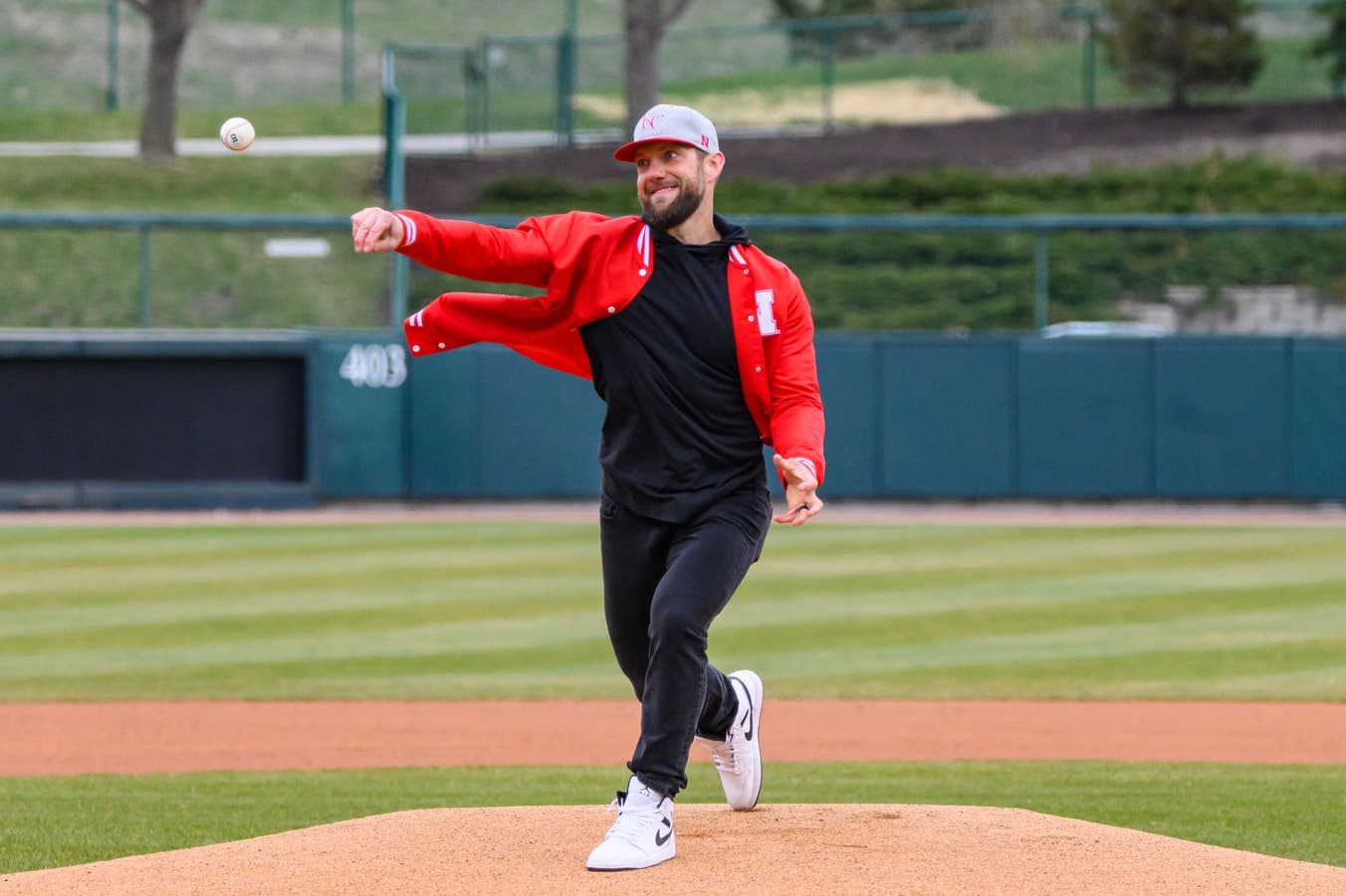 - Former Nebraska Cornhusker and Kansas City Royal Alex Gordon throws the first pitch before the Huskersā game against New Mexico State.