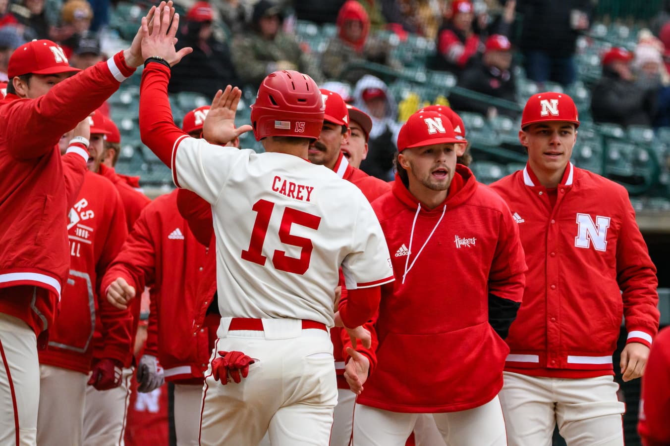 - Joshua Overbeek celebrates his first home run as a Husker