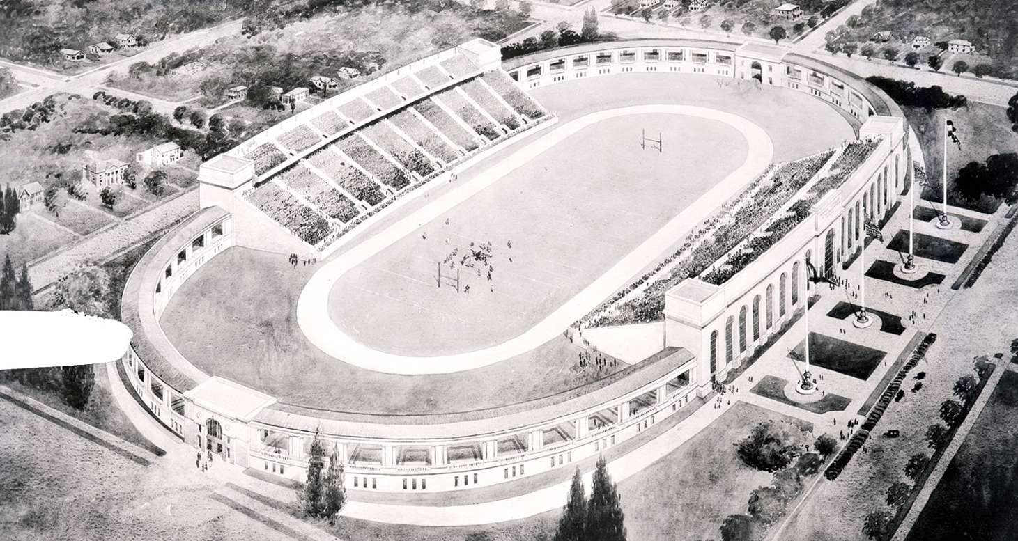 1922: A rally takes place on campus to drum up student pledges for the building of Memorial Stadium. The goal is to have students chip in $90,000 of the anticipated $430,000 construction cost. Although overall pledges and donations had topped $454,000 within a year, rising costs meant the oval ends never came to fruition.